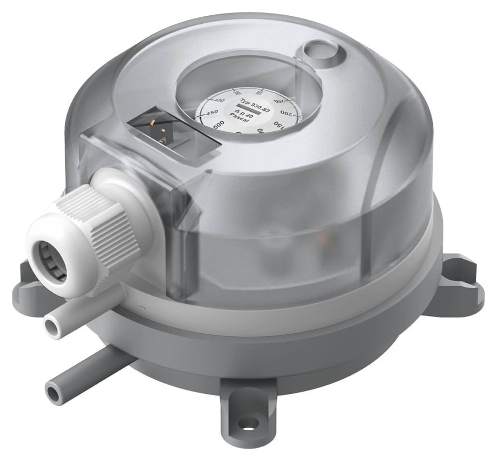 The switching pressure can be adjusted without a pressure gauge using a scaled adjustment knob. Various versions with overlapping adjustment ranges between 0.2 mbar and 50 mbar are available for this purpose. As standard, the pressure switch is equipped with a transparent cover of protection class IP54.